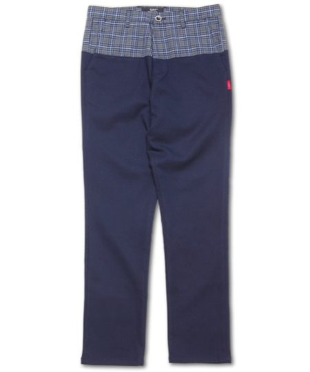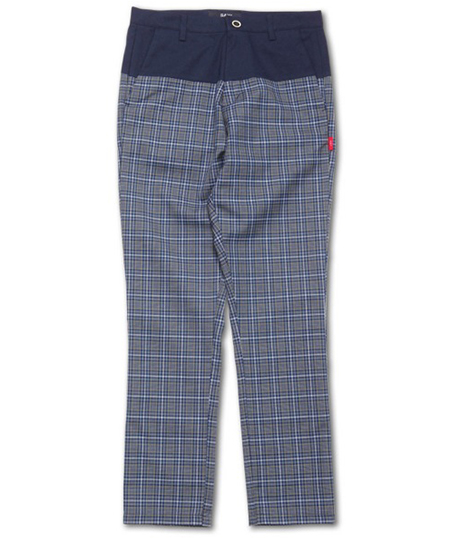 高級なデッドストックのテトロンウールチェックと高品位のTRサージストレッチを使用したパンツ。 バイカラーの切替えと計算された細みのシルエットが魅力。