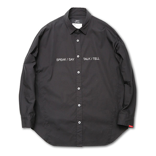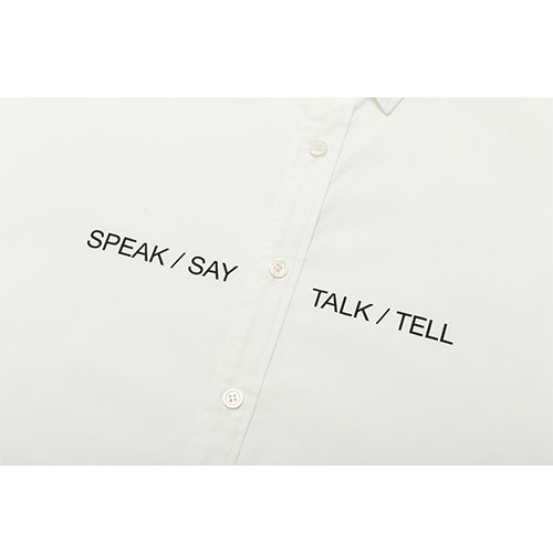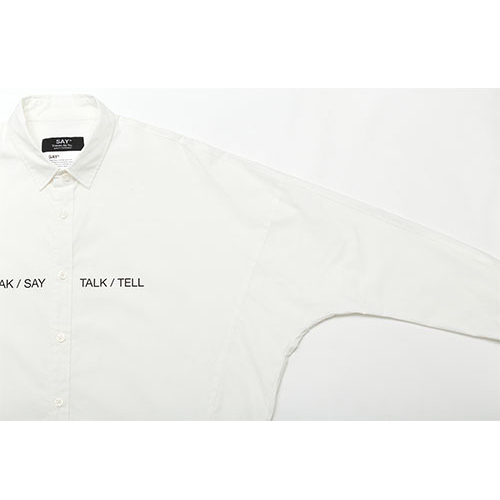 “SPEAK/SAY/TALK/TELL” といった “話す” を意味する言葉がプリントされたドルマンスリーブとオーバーサイズが特徴のビッグシャツ。