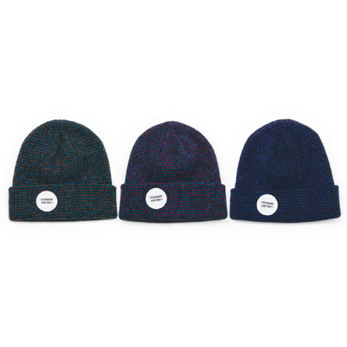 COMMENTARYブランドワッペンを施したニットビーニー。 ブラック×ブルーのベースにミックスされた配色が魅力。