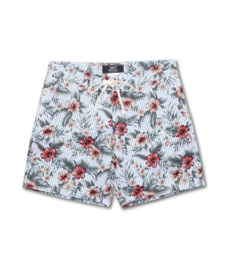 【数量限定】 先染ストライプにトロピカルプリントを施したショーツ。 絶妙なシルエットも魅力。